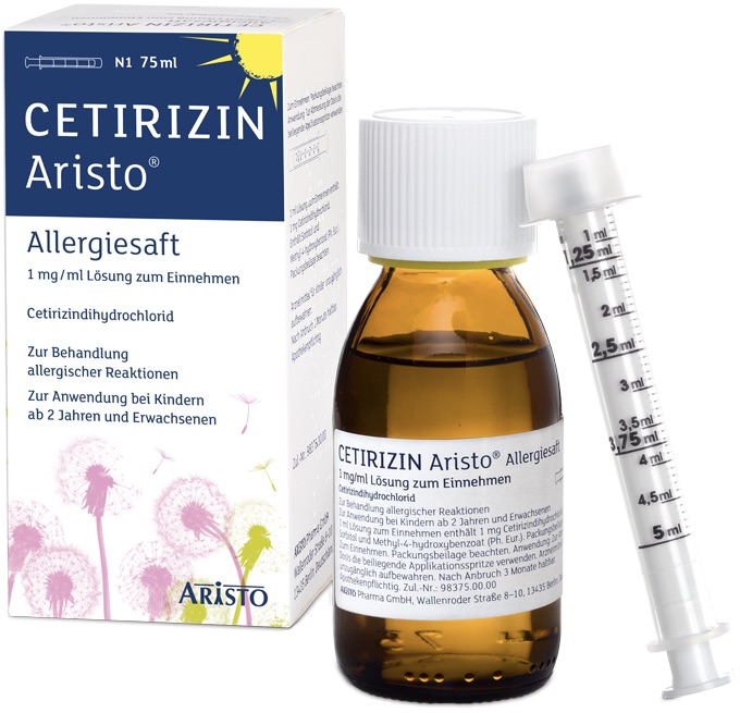 Der Cetirizin Aristo® Allergiesaft zur Linderung von Nasen- und Augensymptomen bei saisonalen und ganzjährigen Heuschnupfen. Der Allergiesaft ist bereits für Kinder ab 2 Jahren zugelassen. Durch die praktische Applikationsspritze kann dieser auch Kindern, die sich mit der Einnahme von Tabletten schwertun, ganz leicht und ohne Kleckern und Kleben gegeben werden.